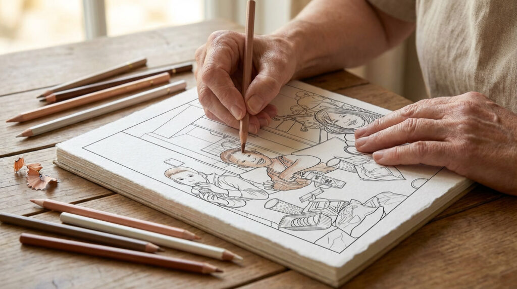 Close-up of hands turning pages in a floral photo book, symbolising shared remembrance
